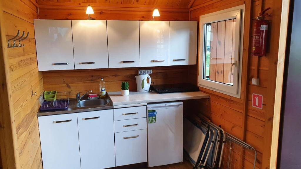 - wyposażony aneks kuchenny (kuchenka, lodówka, naczynia, sprzęt do przygotowywania posiłków, czajnik, ekspres przelewowy)